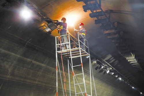 走進隧道,一股冷風侵襲,洞內(nèi)風大又潮。來自湖北的游師傅,負責噴隧道墻面乳膠漆。他有著20多年的豐富經(jīng)驗,在施工現(xiàn)場,他頭戴安全帽,身穿反光背心,緊系安全繩,一個人站在高高的架子上,底下4名工人不時緩緩地推動登高架。游師傅全然不顧洞內(nèi)的濕冷,大手一揮,熟練而均勻地噴灑著油漆,沒多久墻面便嶄新一片。