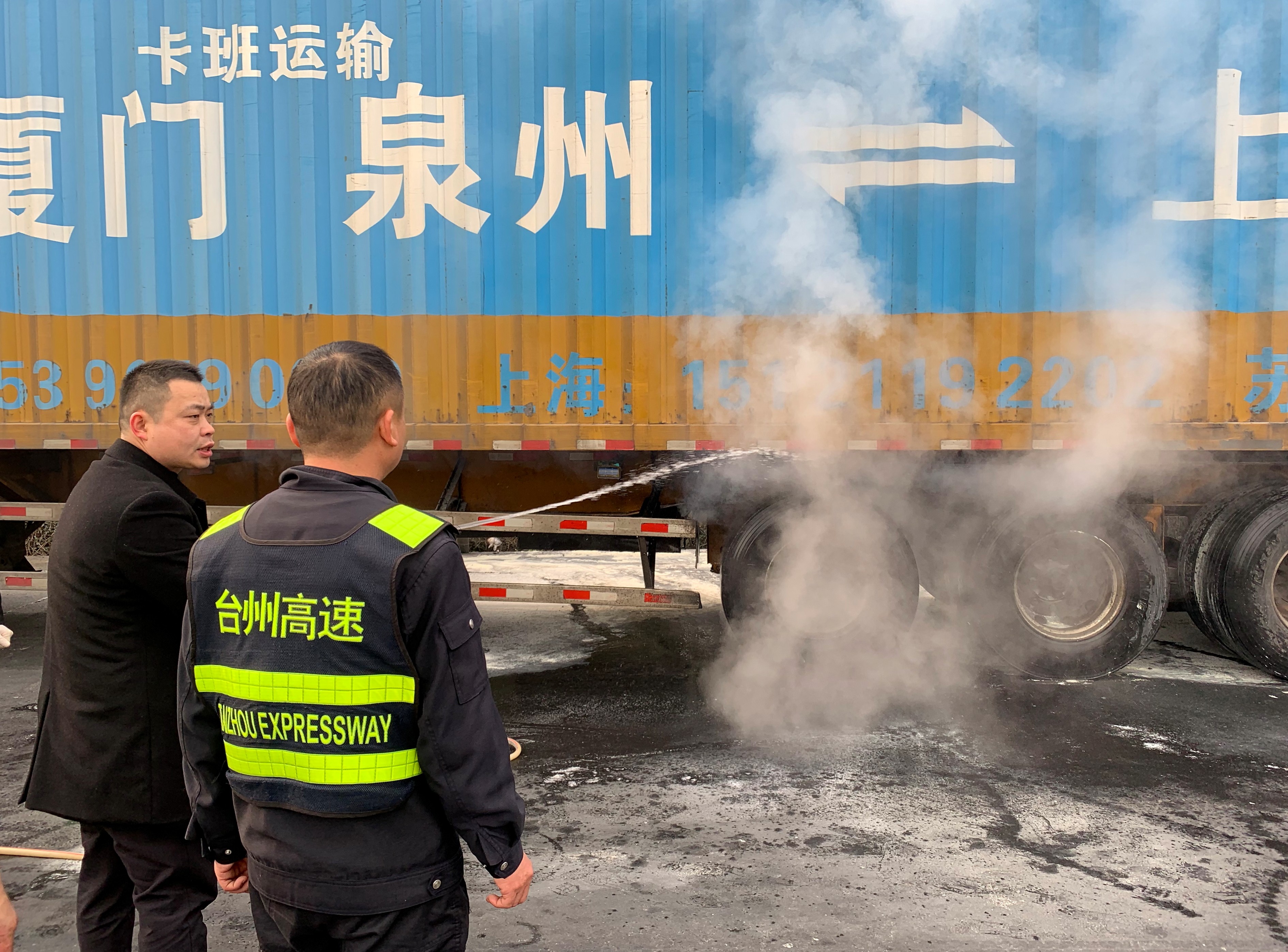 (圖為工作人員奮力救火) 就在這時,突然又一聲巨響, 貨車輪胎發(fā)生二次爆炸,火苗再次復(fù)燃。但大家絲毫不畏懼,提起滅火器對準著火點,快準狠,火苗再次被撲滅。現(xiàn)場,輪胎處還冒著白煙,監(jiān)控中心何先林提議利用車道上的兩根水管的水對車輛輪胎進行沖水降溫,避免再次發(fā)生爆炸。 經(jīng)過長達半小時的緊急救援,火勢終于得到控制,無人員傷亡,車輛也沒有造成損失。據(jù)了解,該車起火原因是輪胎上有鐵絲,摩擦產(chǎn)熱導(dǎo)致輪胎爆炸起火。 “太感謝了,全靠你們發(fā)現(xiàn),及時止損,不然車就燒沒了。”駕駛員連聲道謝。 在此提醒廣大司乘人員,上高速前務(wù)必要對車輛進行全面檢查,特別是輪胎、剎車等重要部位,避免行車途中發(fā)生故障導(dǎo)致嚴重后果。 任青青