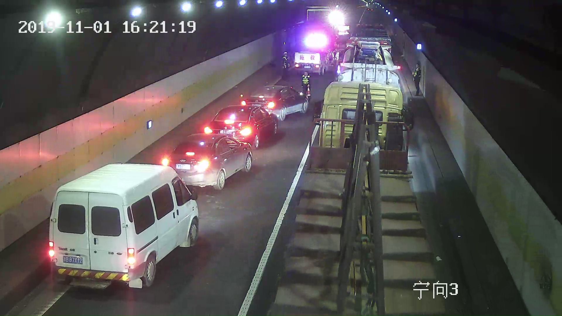 隧道內(nèi)三車追尾,“指揮員”“救援隊”“搬運工”齊上陣 11月1日14時23分,黃土嶺隧道所中控員王之佳發(fā)現(xiàn)寧向隧道進(jìn)洞300米處超車道發(fā)生一起三車追尾交通事故。于是,執(zhí)勤隊員火速趕赴事故現(xiàn)場。 事故現(xiàn)場,一輛貨車橫跨在超車道上,貨車上的桔子散落一地,現(xiàn)場一片狼藉,事故車輛占用了隧道內(nèi)僅有的兩個車道,導(dǎo)致后方車輛一度無法通行。所幸的是司機(jī)只有輕微受傷。