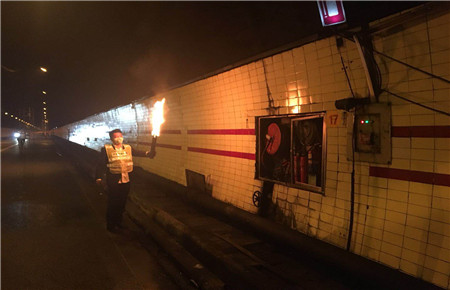 期間,大溪嶺隧道所執(zhí)勤隊員積極配合,對隧道內(nèi)消防設(shè)施設(shè)備進行了全面測試,著重檢查了滅火器的使用期限、有無泄漏現(xiàn)象,消防栓能否正常開啟、出水效果如何,消防水帶有無損壞等。經(jīng)檢測,隧道內(nèi)火災(zāi)報警系統(tǒng)全部正常。同時利用隧道清洗之際,與各施工單位簽訂“施工安全告知書”。并進行現(xiàn)場查看,發(fā)現(xiàn)施工單位的腳手架沒有貼發(fā)光標志,存在安全隱患,立即要求施工單位負責人當場整改。