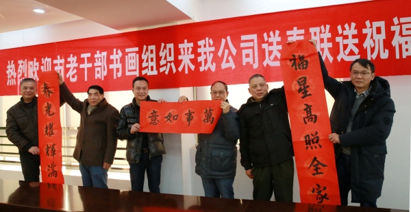市老年書畫研究會(huì)會(huì)長(zhǎng)楊通河一行來公司送春聯(lián)送祝福 1月17日下午,市老年書畫研究會(huì)會(huì)長(zhǎng)楊通河,市直機(jī)關(guān)老干部書畫協(xié)會(huì)領(lǐng)導(dǎo)施巨日、陳孔梅一行來公司送春聯(lián)送祝福,感謝公司對(duì)研究會(huì)的支持和關(guān)愛,祝愿公司在新的一年里紅紅火火,萬事如意,經(jīng)營(yíng)發(fā)展越來越好。