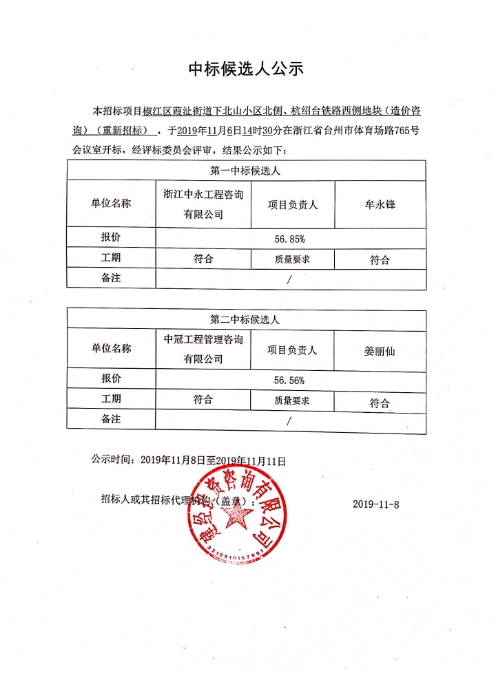 椒江區(qū)葭沚街道下北山小區(qū)北側(cè)、杭紹臺(tái)鐵路西側(cè)地塊(造價(jià)咨詢(xún))中標(biāo)候選人公示