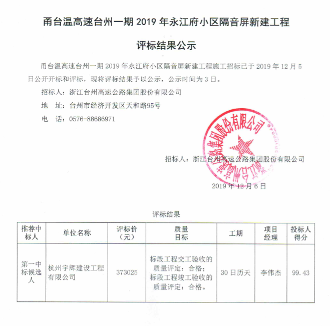 甬臺(tái)溫高速臺(tái)州一期2019年永江府小區(qū)隔音屏新建工程評(píng)標(biāo)結(jié)果公示