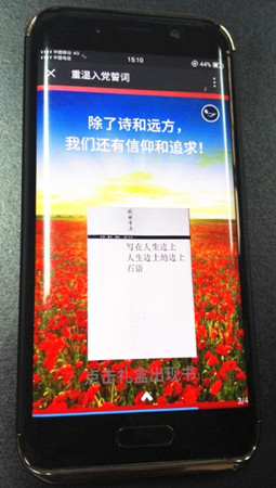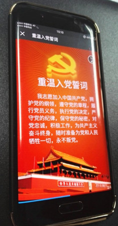 “凝視黨旗,我把奉獻(xiàn)刻心里;舉起右拳,我把責(zé)任刻心里;宣讀誓言見證我對(duì)黨的忠誠(chéng);這崇高的選擇是我終身的信仰----”點(diǎn)開微信圖文信息,伴隨著低沉渾厚的男聲詩朗誦,接收到信息的黨員們不由肅然起敬,仿佛置身當(dāng)年黨旗下宣誓的莊嚴(yán)時(shí)刻。