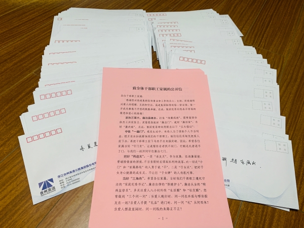 集團開展致全體干部職工家屬的公開信活動 6月18日,集團緊貼廉政教育月活動要求,將“致全體干部職工家屬的公開信”交到每一名職工手中,以這種家書形式廣泛宣傳廉潔清正的重要性,呼吁他們爭當反腐倡廉的“廉內(nèi)助”。