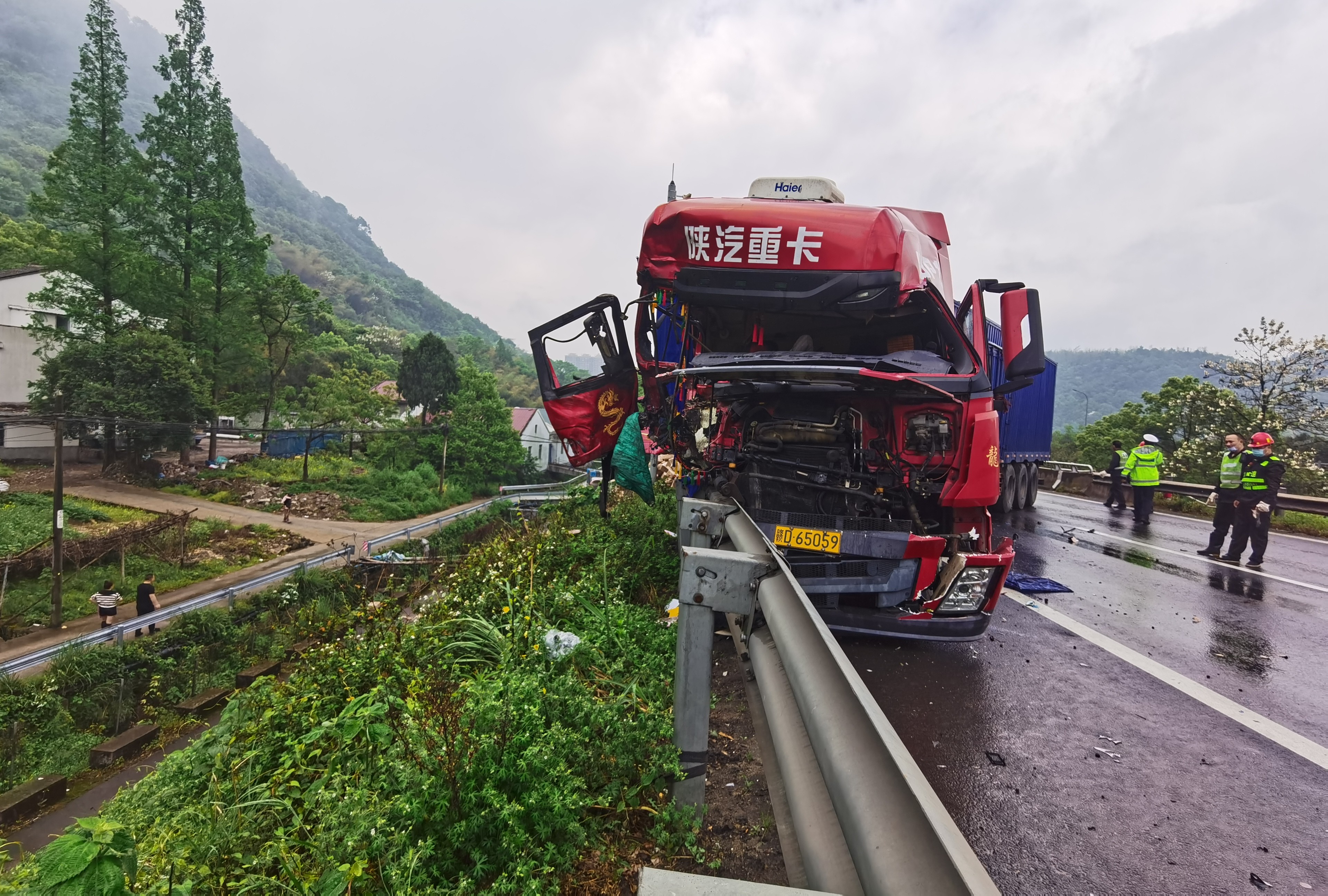 寧向洞口200米處,有一輛14米長的箱式大貨車避讓不及撞上了一輛平板小貨車,隨即又撞到隔離護欄,整個車頭瞬間被撞得七零八碎嚴重變形,車尾橫向路面且僅留小車能駕駛的空間。被追尾平板貨車所載貨品散落一地,高速路上、護欄外一片狼藉,所幸無人員傷亡,大貨車司機膝蓋輕微傷。