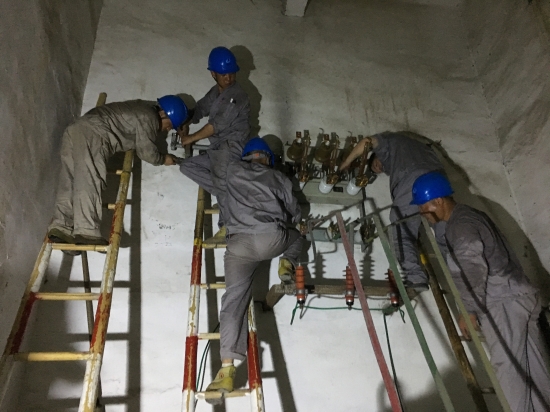 19點40分,高壓負荷開關(guān)到位。搶修人員安照各自的分工,掛接地電阻、拆卸舊件、重做高壓電纜接頭、安裝新跌落熔絲......就在大家以為快要完工時,卻發(fā)現(xiàn)新開關(guān)的聯(lián)動拉桿接口要略大于舊桿,任憑搶修人員如何用力都無法與底下操作桿連接,但大家并沒有放棄,而是用磨光機一點點打磨,一次次試驗,在損耗了兩張磨光片后終于將兩桿順利連接。之后,大家再一鼓作氣,將調(diào)試好的負荷開關(guān)固定在離地面3米之高的墻上,并成功連接電纜。