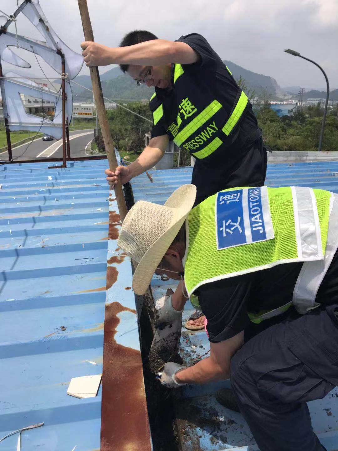全面清除收費(fèi)頂棚及下水管道垃圾。集團(tuán)沿線收費(fèi)頂棚經(jīng)過幾次的施工裝修,遺留了一些裝飾垃圾,如不及時清理一旦掉入排水溝或下水管道,勢必會造成頂棚漏水,影響下面人員及設(shè)備安全。8月7日,維養(yǎng)中心組織班員在登高車協(xié)助下,頂著炎炎烈日,利用垃圾夾、鐵鍬等工具對沿線收費(fèi)站收費(fèi)頂棚上方垃圾、排水溝中的淤泥進(jìn)行了逐一清理,并重新鋪設(shè)排水溝上面的防護(hù)網(wǎng),防止臺風(fēng)期間吹來的一些塑料紙袋等輕型垃圾再次堵塞下水道。