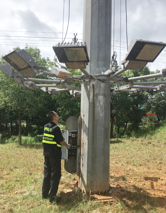 及時下降各收費(fèi)所互通區(qū)高桿燈。為提升互通區(qū)照明亮度,減少因選錯路口而帶來的不必要的麻煩,集團(tuán)在各收費(fèi)站出入口互通區(qū)共安裝了11盞40米高度高桿燈,每盞高桿燈上方有12盞鈉燈。倘若這些高桿燈上鈉燈在臺風(fēng)襲擊下一旦掉落后果將不勘設(shè)想。8月8日,中心再次召集各班人員對收費(fèi)沿線高桿燈進(jìn)行了下降處理。因高桿燈四周雜草叢生,在下降時維修隊員不僅要忍受底下蚊蟲肆意叮咬,還要克服時而烈日時而大雨的怪異天氣,沒放幾盞隊員便濕透了全身,衣服是濕了又干,干了再濕。