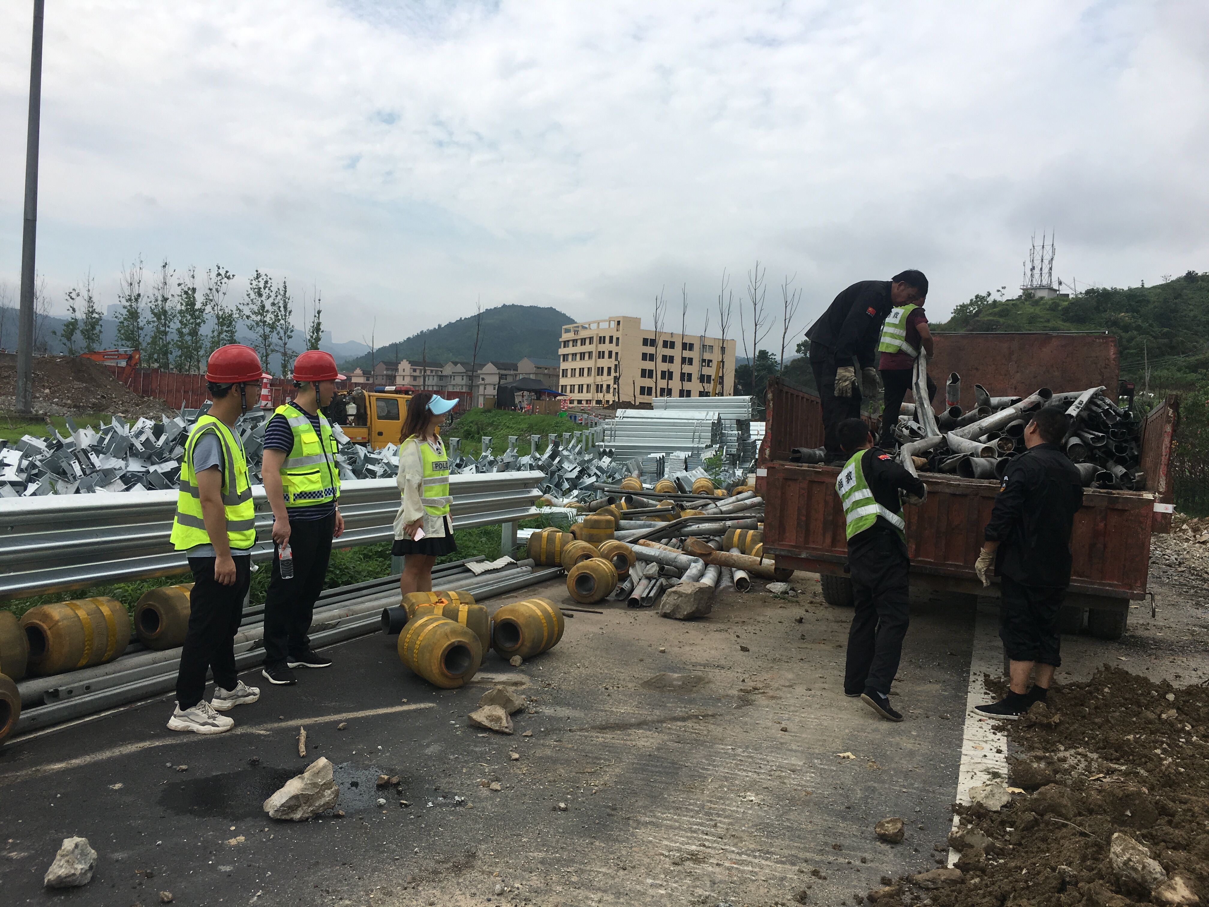 圖為廢舊物資處置現(xiàn)場(chǎng) 一大早,小組成員直接抵達(dá)事故現(xiàn)場(chǎng),戴上安全帽、穿上反光背心,伴隨著“轟隆隆”的打樁聲,大家穿過(guò)臨時(shí)為高架橋斷層搭建的鐵梯,從布滿(mǎn)碎石的緩坡爬上施工區(qū)。此時(shí)挖掘機(jī)、裝載機(jī)等不停作業(yè),現(xiàn)場(chǎng)灰塵彌漫,環(huán)境惡劣,大家冒著酷暑一直守在現(xiàn)場(chǎng)監(jiān)督,對(duì)廢舊物資進(jìn)行分類(lèi),逐一清點(diǎn),嚴(yán)把廢舊物資處置關(guān)。
