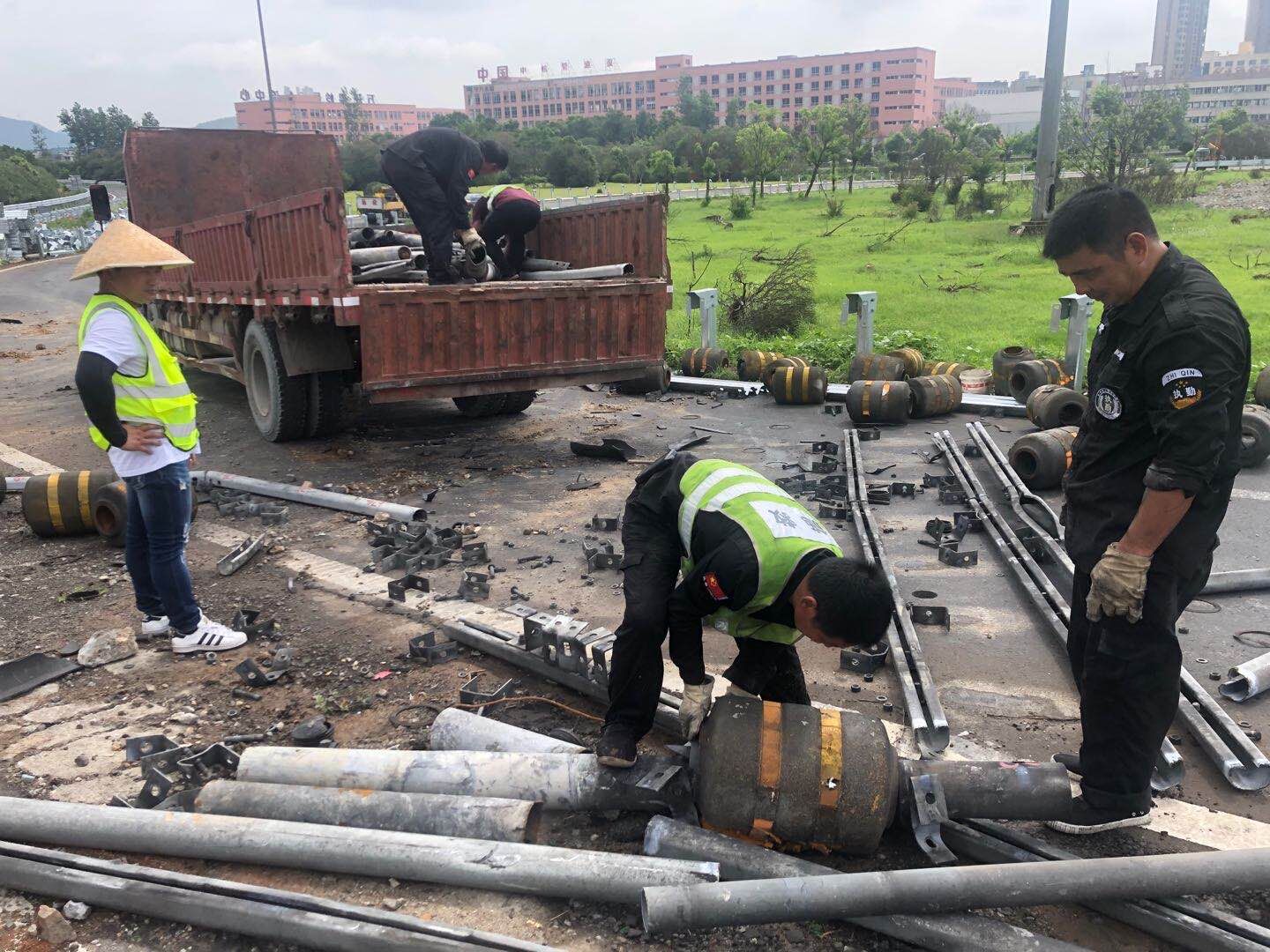圖為各部門(mén)小組人員監(jiān)督現(xiàn)場(chǎng) 此次廢舊物資數(shù)量大,護(hù)欄板因高溫沖擊造成了強(qiáng)烈的扭曲變形,這無(wú)疑給裝載增加了難度。大家和裝載人員一起想辦法,以便更好地裝車(chē)安全抵達(dá)院橋磅秤站。盡管天氣燥熱、環(huán)境嘈雜,可絲毫未影響小組成員的工作熱情,因時(shí)間倉(cāng)促,所有人利用午休時(shí)間加快工作進(jìn)度,一直堅(jiān)守現(xiàn)場(chǎng)。在趁車(chē)裝載間隙,兵分兩路,一隊(duì)現(xiàn)場(chǎng)盯裝車(chē),另一隊(duì)由林軍帶領(lǐng)趕往塘嶺廣場(chǎng)、臺(tái)州收費(fèi)所,對(duì)阻塊等廢舊物品進(jìn)行勘察,隨后又馬不停蹄趕往院橋磅秤站匯合監(jiān)督過(guò)磅環(huán)節(jié)。 直至下午5點(diǎn),大家終于結(jié)束工作。據(jù)統(tǒng)計(jì),此次共處理廢棄物資約15噸。 毛譯聆