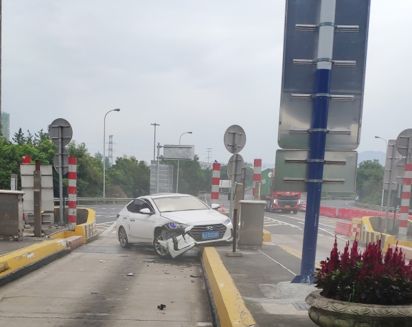 碰撞后的轎車半邊車身掛在了安全島上,車道上的光幕也因撞擊受損。收費班長在聽到一聲巨響后,第一時間跑上前去查看情況。因為劇烈的撞擊,轎車的右側(cè)已經(jīng)在地上灑落一堆碎片。坐在副駕駛的女士從車上下來查看車況,隨后男司機(jī)也從另一邊打開車門下來。所幸撞擊并未造成人員受傷。班長在確認(rèn)司機(jī)及乘客均無受傷后,一邊將事故報告監(jiān)控中心施救車輛前來救援,一邊提醒司機(jī)報警,人員站到安全島上方,不要隨意在車道上走動。然后迅速跑到車道入口將水碼擋在車道口以防止有其他車輛誤入發(fā)生二次事故