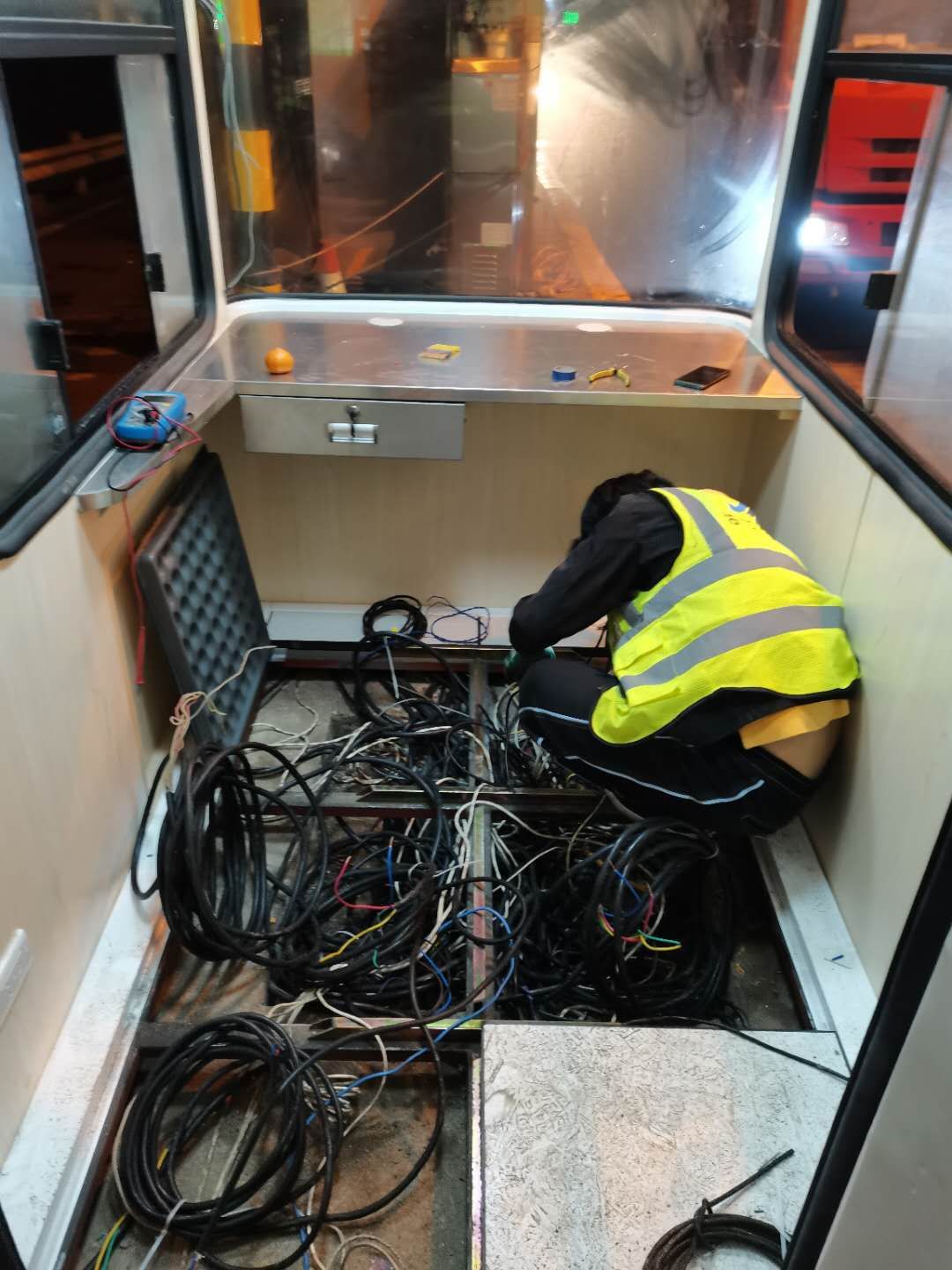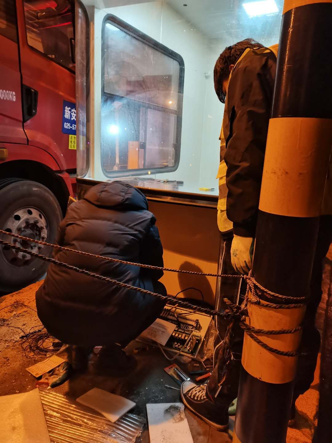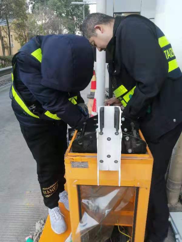 21日下午4點左右,訂購的新崗?fù)ず蛽p壞的設(shè)備設(shè)施陸續(xù)到位,中心值班人員協(xié)同設(shè)備廠家一起將其安放并固定至車道原位置。因崗?fù)A倒時拉斷了底下很多線纜,在拆除設(shè)備時又因為緊急搶修需要沒有作相應(yīng)標注,現(xiàn)場各種電線接頭雜亂如麻??紤]到夜間查線、接線存在一定的安全隱患,也不利于施工,搶修人員決定第二天再戰(zhàn)。
